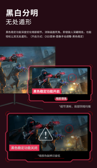 优派vx2563-hd-pro提供99% srgb广色域覆盖率,支持原生8bit色深,画面色彩真实靓丽,细节丰富不断层;具有的黑色稳定功能,可深度优化暗部细节,消除画面死角,能轻松让深藏暗处的敌人无处遁形,在游戏中保持领先优势。