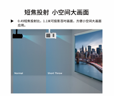 lsd400hd-st采用0.49短焦投射比设计,只需1.1米即可投影出100寸大画面,极大地提升了空间利用率。相比传统投影机需要较长距离才能实现大画面,lsd400hd-st特别适合空间受限的会议室、教室、展厅、橱窗展示等场景,用户无需重新规划空间布局即可轻松部署。