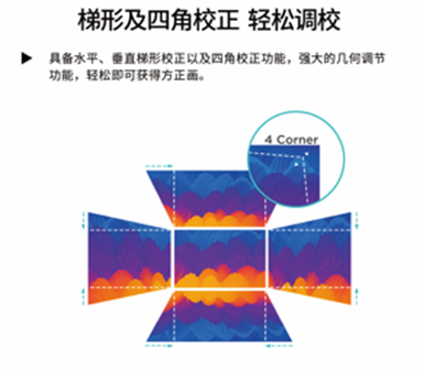 短焦设计不止减少了投影距离对画面大小的限制,也有效避免了投影过程中人员遮挡光路的问题,提升演示流畅度与观众体验。结合±15°垂直与水平梯形校正、四角校正功能,用户可快速调整画面形状,无需复杂调试即可获得方正画面,显著提升部署效率。