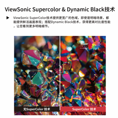 结合1080p全高清分辨率,lsd400hd-st在画面锐度、色彩饱和度与动态表现方面均达到专业级水准。支持蓝光3d播放功能,用户只需佩戴dlp link 3d眼镜,即可享受沉浸式立体影像体验,适用于教学演示、展览展示及娱乐应用。此外,lsd400hd-st支持4k信号输入与hdr内容显示,可呈现更丰富的亮暗细节与更广的色彩层次,进一步提升视觉表现力。搭载viewsonic supercolor™广色域技术与dynamic black技术,无论是明亮场景还是暗部细节,都能呈现层次分明、色彩鲜活的画面。