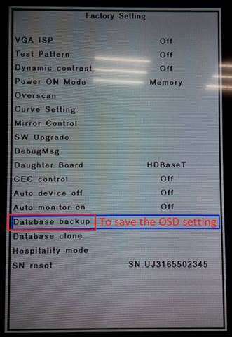 4. in factory menu, select database backup to save osd setting